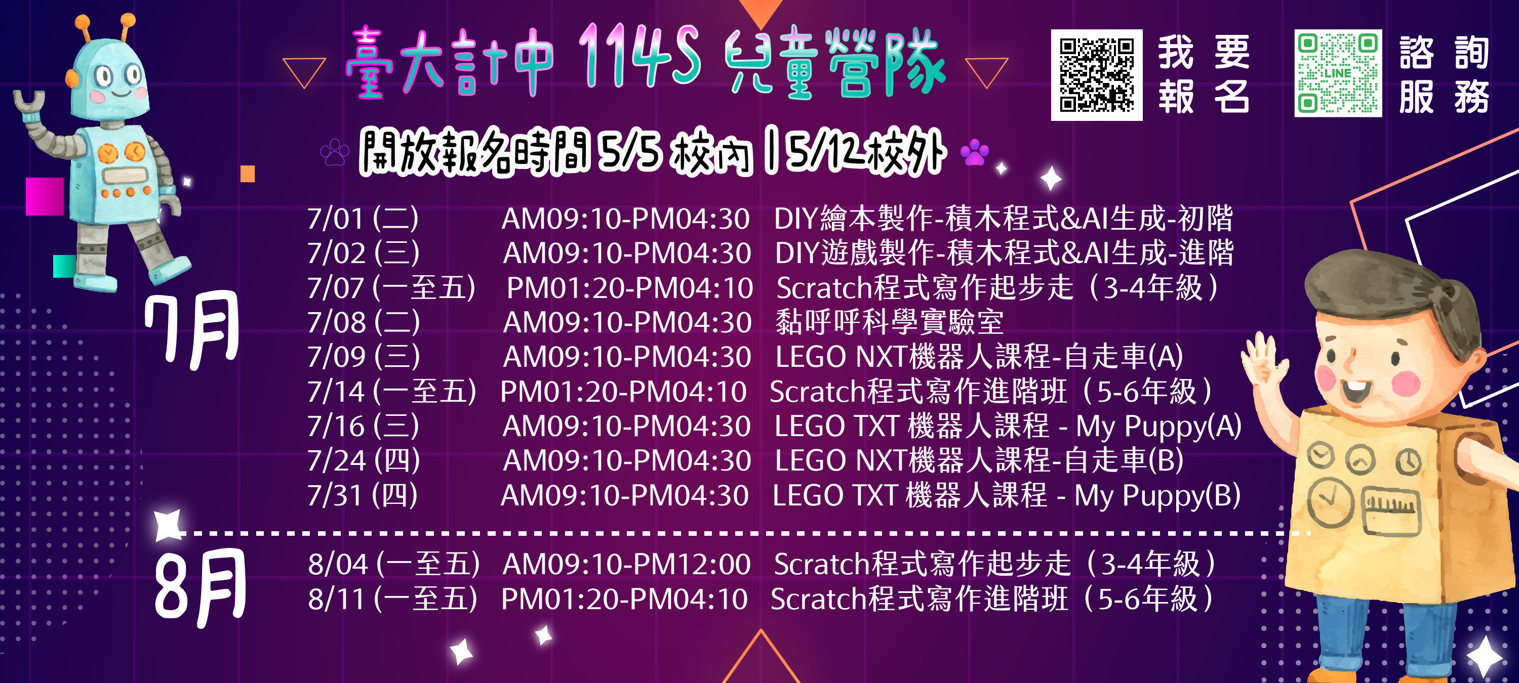 一、本校計算機及資訊網路中心於114年6月18日起辦理暑假資 訊應用課程,課程詳細資訊與報名網址請至該中心網站查 詢https://teach.cc.ntu.edu.tw/course。