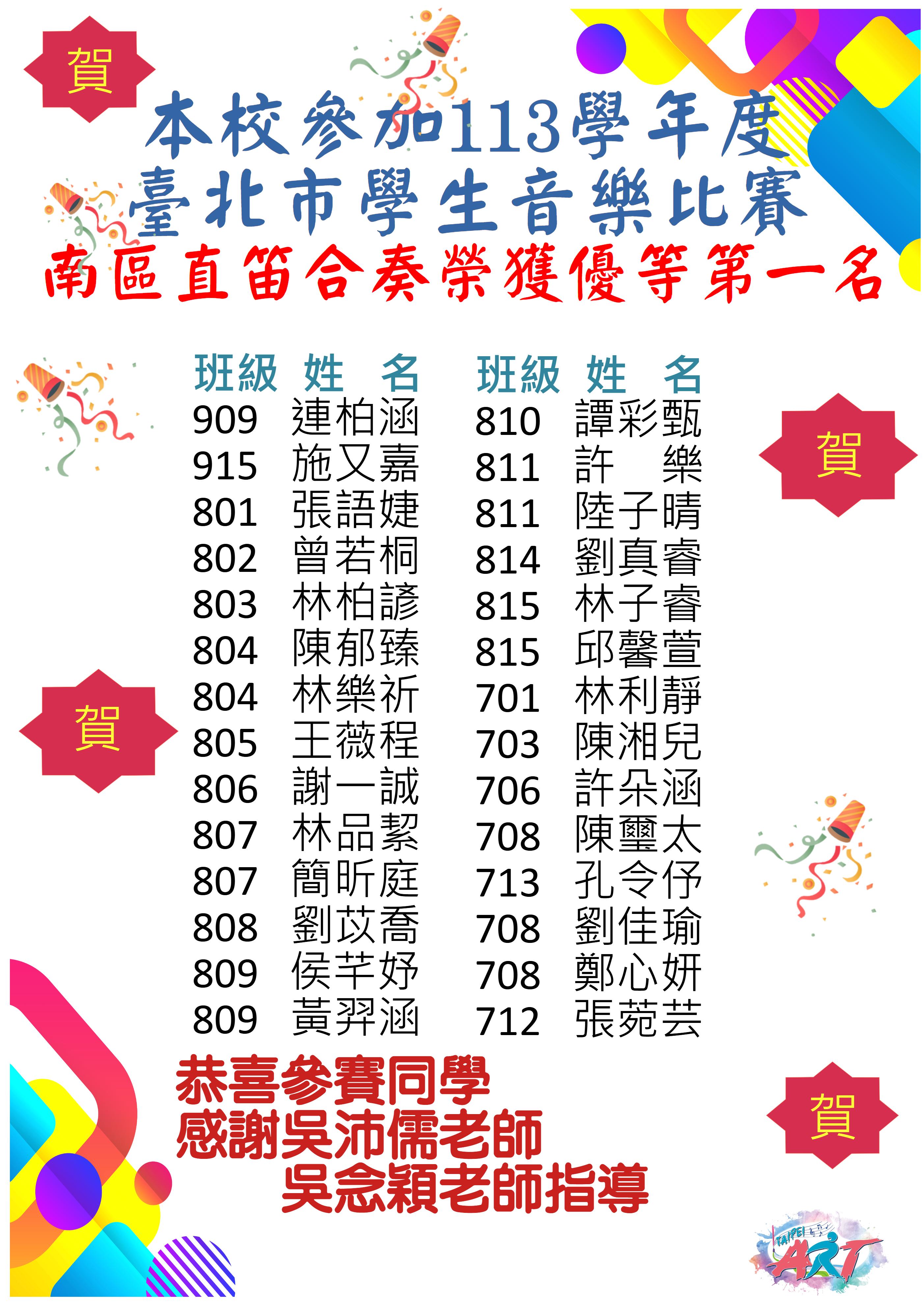 賀!本校參加113學年度臺北市學生音樂比賽榮獲南區直笛合奏優等第一名佳績!