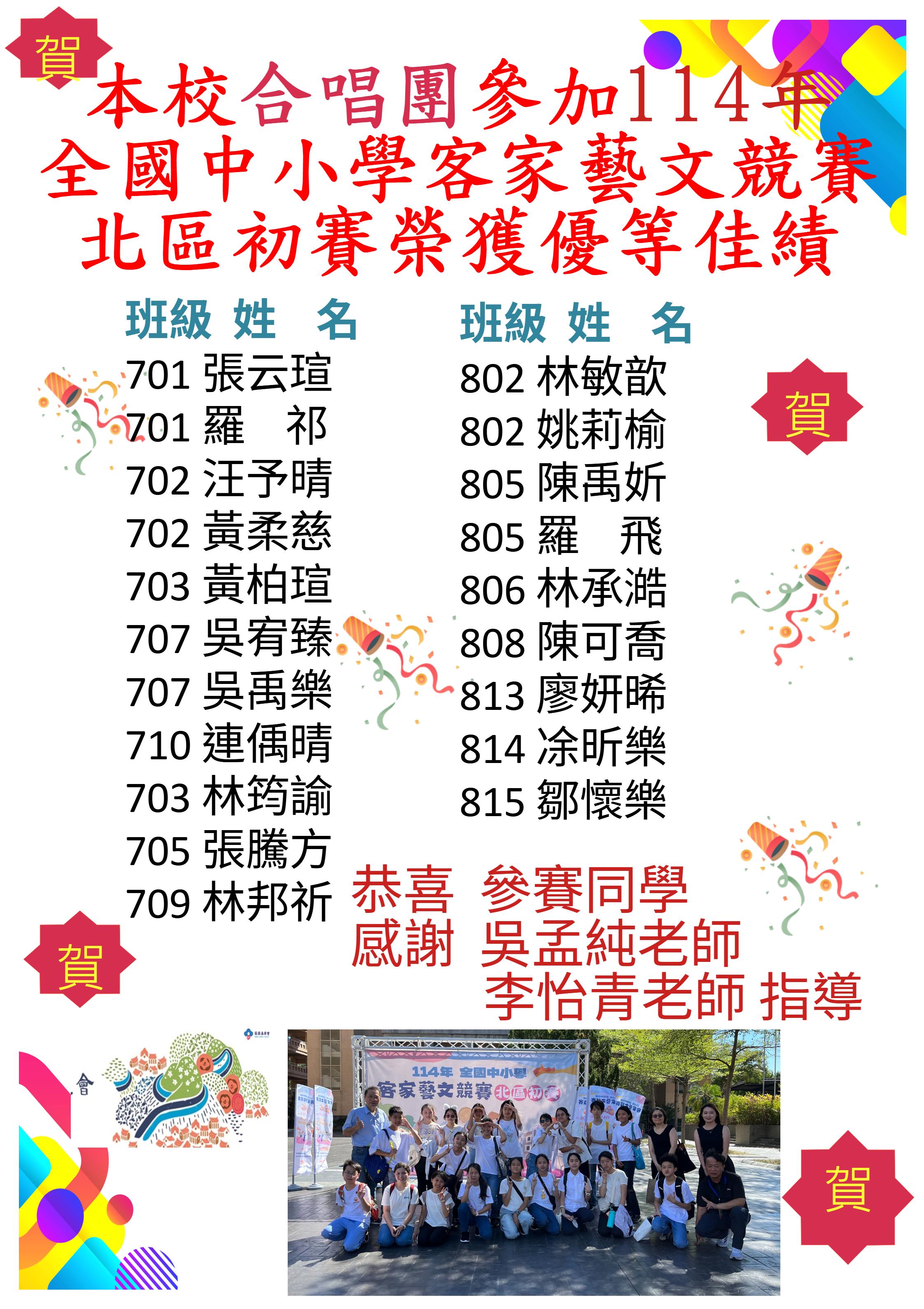 賀!本校合唱團參加114年全國中小學客家藝文競賽北區初賽 榮獲 優等 佳績!