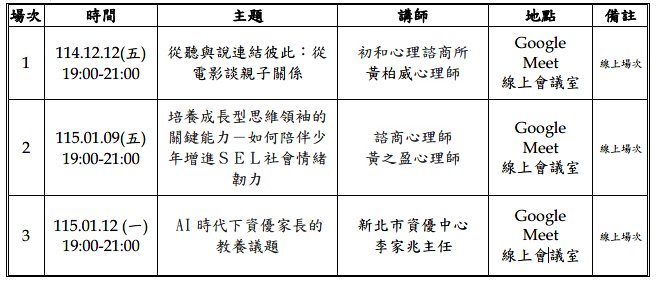三、本親職系列講座共計辦理3場次,各場次講座資訊、報名及錄取方式如下: