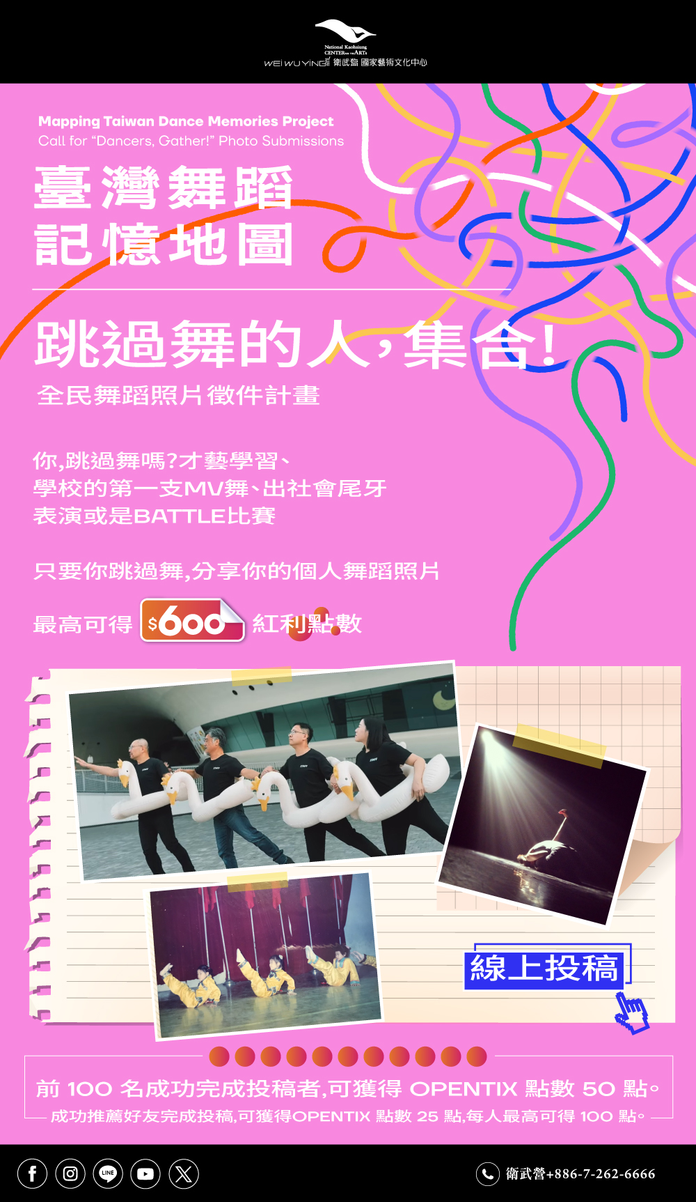 章(附件二)或衛武營官網網址:https://npacwwy.tw/en08gMrIj,邀請師生共同參與投稿,擴大舞蹈記憶之 蒐集與交流。
