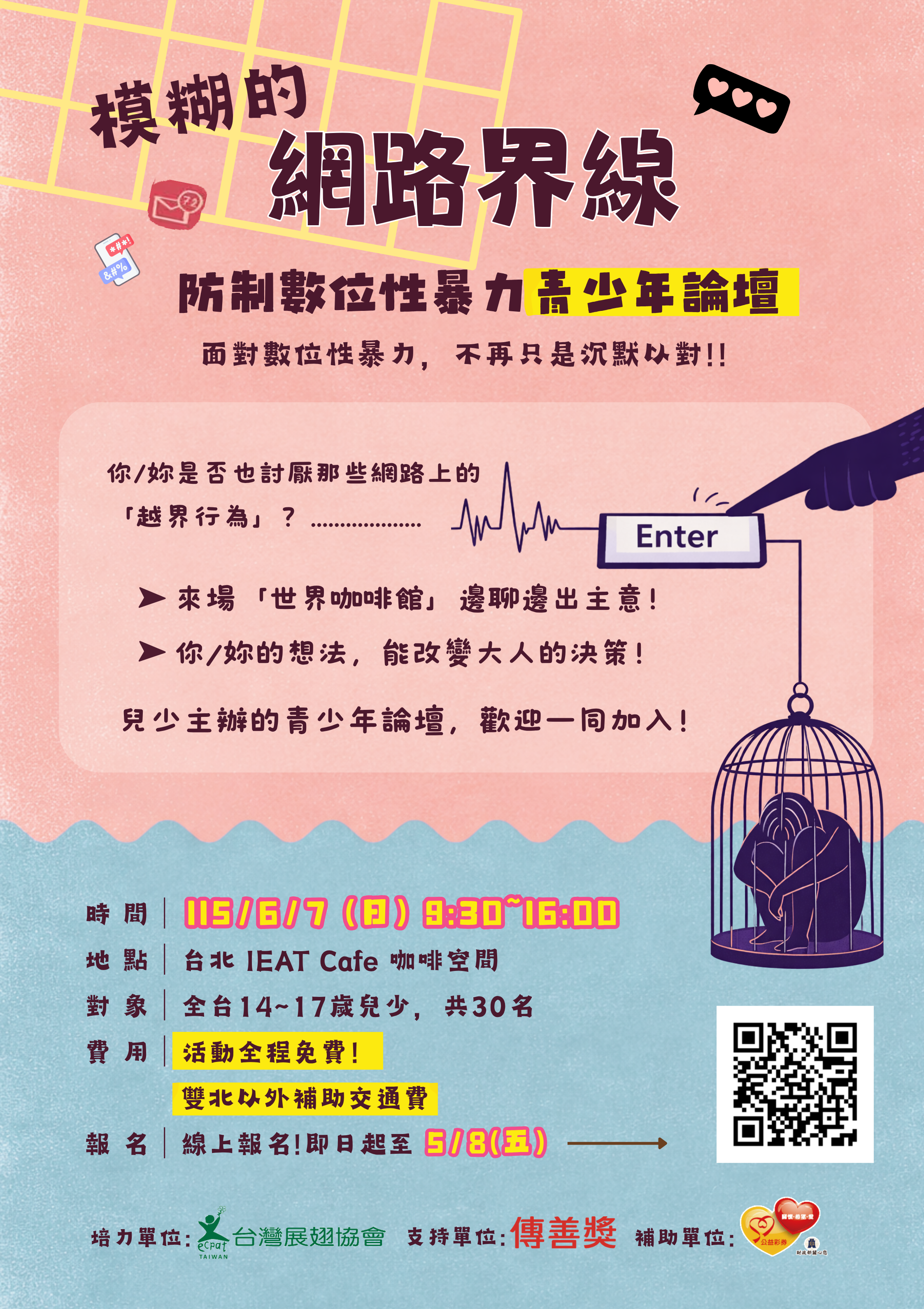 一、為提升兒少對「數位性暴力」議題之認識,以及促進兒少 表達與參與,由台灣展翅協會培力之兒少團隊將於2026年6 月7日(日)舉辦「模糊的網路界線:防制數位性暴力青少 年論壇」,以「數位性暴力」為討論主軸,探討在數位環 境中的互動與界線,廣邀全台兒少從自身經驗出發進行交 流與討論。