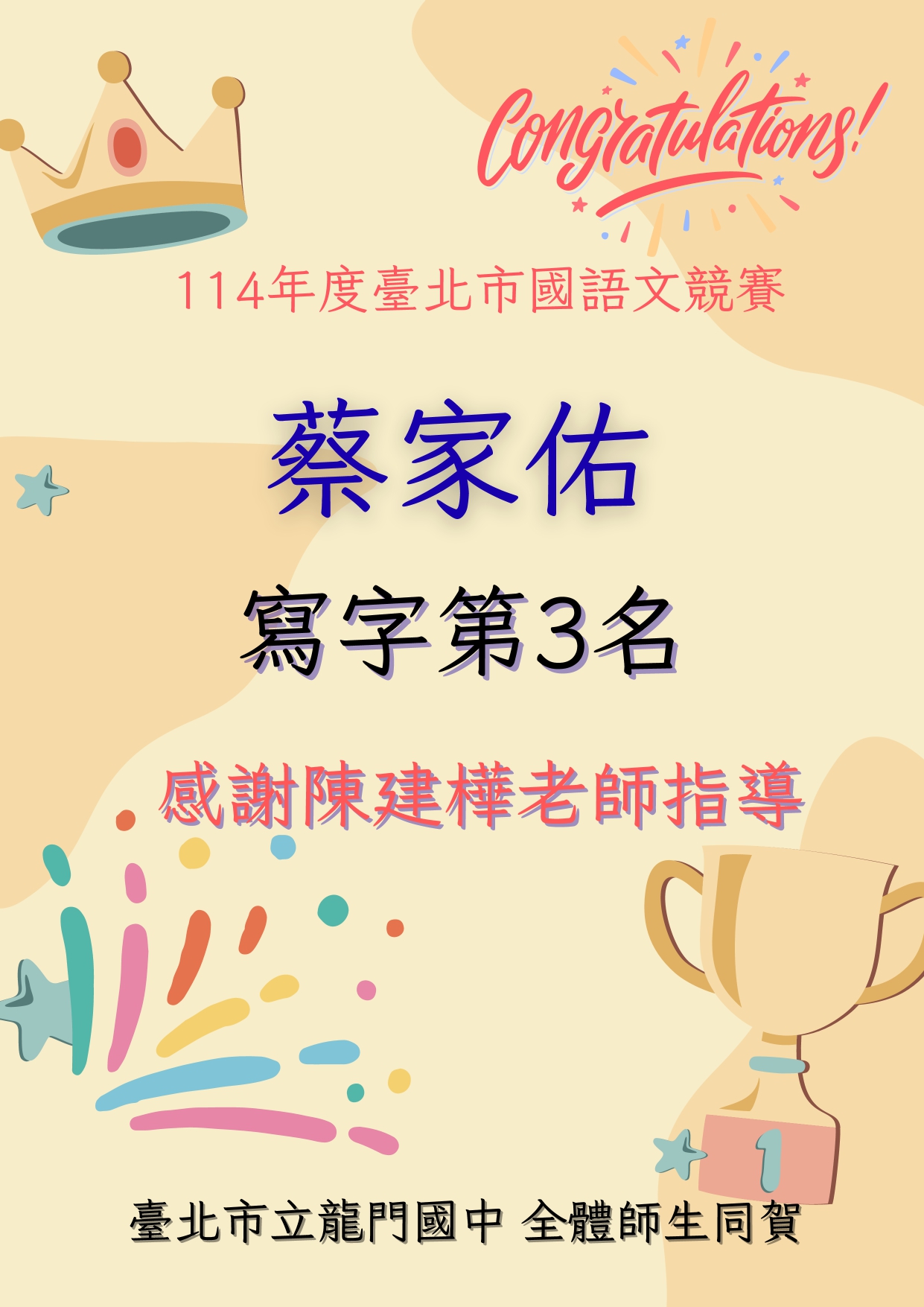 賀!本校907蔡家佑同學榮獲【114年度臺北市國語文競賽】寫字第3名! 感謝陳建樺老師辛苦指導